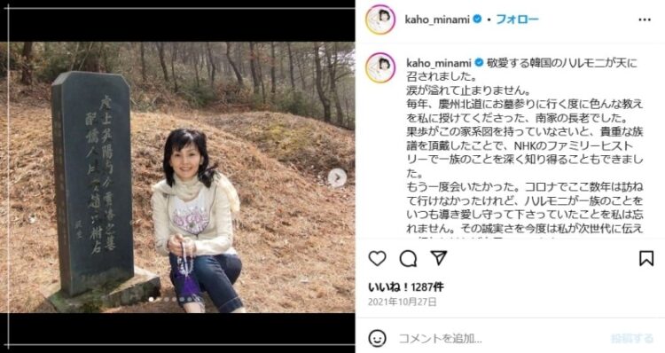 2012년 NHK 다큐 패밀리 히스토리에서 그녀의 가족사가 방송되었다. 본관은 경북 영양군 영양남씨(英陽南氏)다. 돌아가신 조부와 조모는 소원대로 고향에 모셨으며 매년 산소가 있는 경북을 방문하여 성묘를 한다.