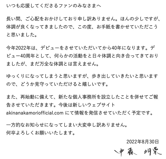 쇼와 우타히메 나카모리 아키나(中森明菜)가 30일 트위터를 통해 데뷔 40주년이 되는 2022년 개인사무소를 설립하고 연예계 복귀를 생각하고 있다고 밝혔다.