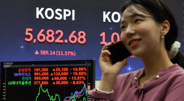 5일 코스피는 9.63% 상승했다. 시가총액 상위주에서 삼성전자 11.27%, SK하이닉스 10.84%, 현대차 9.38%, LG에너지솔루션 6.91%가 오르며 지수가 급등했다. 코스피 수급은 개인 순매수, 외국인과 기관은 순매도로 집계됐다.